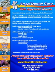 Class start January 14, 2012, so be sure to sign up soon. You can visit Angel Dental Care for more information, or feel free to stop by 3551 Peck Road Suite 101, El Monte, CA 91731 to find out more. You can also call Angel Dental Care at 626-444-2002 anytime. This RDA approved class is affordable, and you’ll be happy that you signed up. Start looking forward to your future of dentistry with classes from Angel Dental Care.